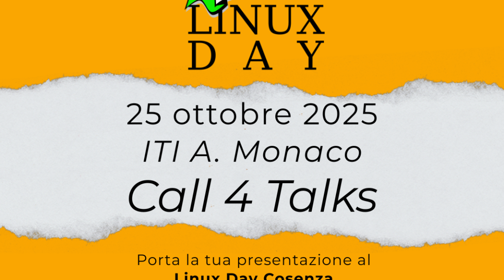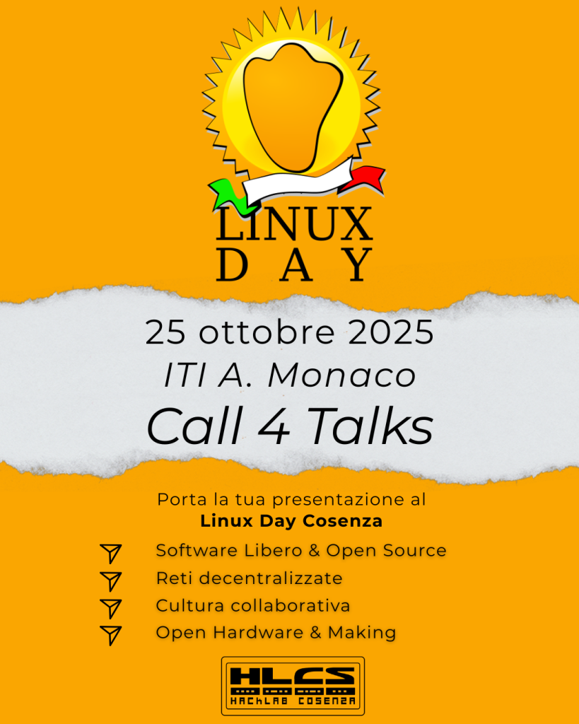 La 25esima edizione del Linux Day, la giornata nazionale dedicata a Linux, al software libero e all’open source & open hardware, sarà anche a Cosenza, organizzata da Hacklab Cosenza con la partnership dell’ITI A. Monaco e della sezione Calabria di Informatici Senza Frontiere.